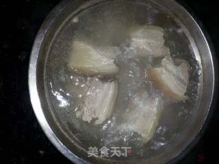 五花肉切大块,放入盆中加水,用电磁炉大火煮。