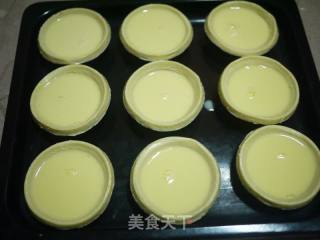 把奶液过滤,均匀倒进蛋挞皮里,8分满就可以了。