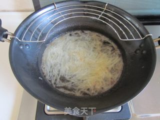 3. 土豆切成细丝泡在水中,去除部分淀粉,在沥干水分;记得一次不要放入太多,放入后要迅速用筷子剥开,将干土豆丝放入锅中炸成金黄, 放在厨房纸巾上吸干油分;