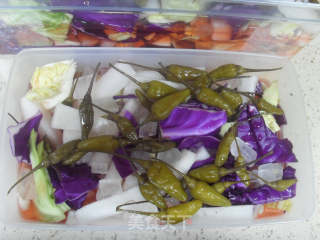 此泡菜做法简单,酸甜可口,辣味适中,颜色亮丽,营养健康,可以不分季节,常年食用。 ”