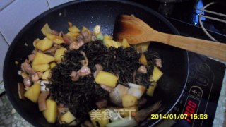 把干菜挤出水分后放在锅里 添水漫过土豆 放大料 白醋一小勺 酱油小半碗