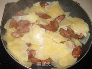 泡好的土豆片沥干水分装盘.腊肠清洗干净切片.