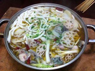 两分钟后放藕和土豆片,土豆粉煮开烧十分钟