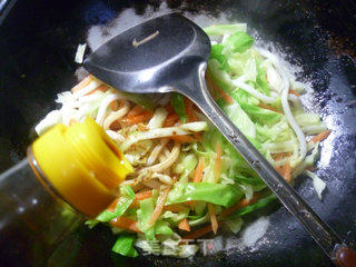 烧锅倒油烧热,下入切好的圆白菜和胡萝卜,加适量的清水。