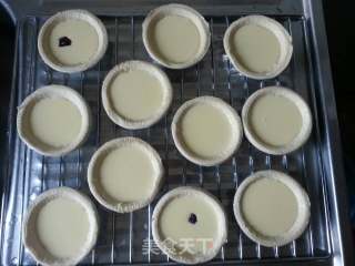 取出冰冻蛋挞皮,分开放置,将刚调好的蛋挞液一勺一勺的加入,8分满即可