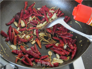锅中留底油,小火爆香麻椒,出味儿后加入姜丝和蒜片,炒出香味儿;