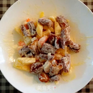 虾和油条,菠萝混合在一起,挤入适量的沙拉酱