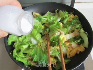 3.再倒入炒好的鸡蛋块,最后放入生菜,生菜微微变色后就可以加入盐等调味料,待翻炒均匀时生菜也会熟了, 不必炒太长时间。