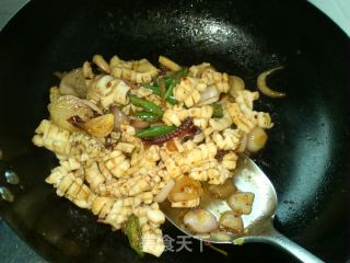 鱿鱼去内脏去外皮,洗净,切花刀。洋葱、青杭椒切片,姜切丝。