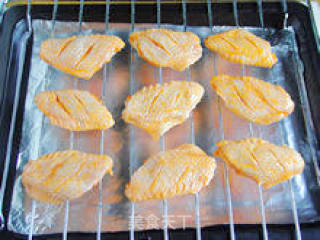 腌好的鸡翅放在烤架上,刷上薄薄一层橄榄油,烤盘里铺上锡纸。