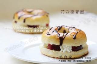 “ 这个不是甜甜圈,不是焙果,就是面包圈。 我懒嘛,懒得炸,懒得煮,所以直接做面包圈啰! 这是上次那个卡梅拉小鸡之后做的,用的是“总统”淡奶油,裱这种小朵朵花还是很成型,但是裱玫瑰是不行的,花瓣要塌! 所以,裱花还是要安佳! ”