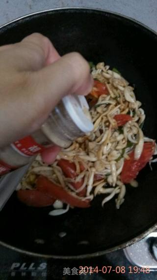 将蘑菇洗净,撕成条,倒入开水焯一下,捞出沥干水分,番茄切块,葱姜蒜切碎备用