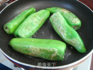 坐锅下油,放入酿好的辣椒