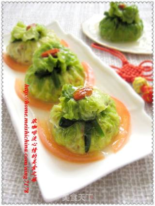 取一张烫好的白菜叶,将馅料放入,收口处用烫软的韭菜系住,上面放一粒枸杞。