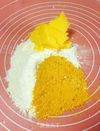 先制作油酥:低粉95g,南瓜粉25g,酥油60g(不用软化),混合揉成面团。
