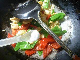 食材:红椒、鸭蛋、荷兰豆(已清洗切开)