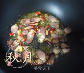 油热后放姜片、腊肉、小尖椒、葱蒜,花椒面炒香,放适量生抽