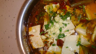 豆腐切片,菜掰断,辣椒切段,姜蒜切粒