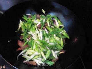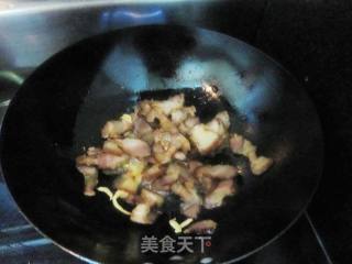 下入腊肉翻炒几下,放入料酒、酱油适量。