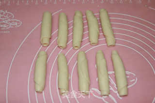 接着将长条的一端用手掌卷起,卷成螺旋状。全部都卷好后之后,盖上一层保鲜膜,在室温下静置10分钟左右