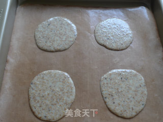 烤盘上铺油布,用勺子舀适量的面糊,用勺背压一下,成大小合适的圆片,入预热好的烤箱,150度,15-20分钟。