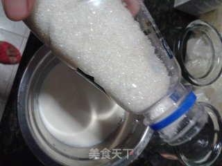 250ML的纯牛奶用一半倒入小盆加糖,另一半放着备用。糖分的多少各人品味而定,喜欢吃甜一点的加多一点,但我品味比轻,放得比较少。