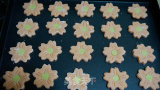 上次做裱花蛋糕,多做了不少奶油花。剩下来的奶油不能浪费,给“她”找个好去处,让“她”能继续优美而优雅。花朵有红有绿,所以把这些奶油花用清水清洗了一下之后,依然有些淡淡的颜色。于是触发了我的灵感,正好可以做成花朵样,将两种颜色的黄油很好的搭配一下。手中正好有樱花饼干模具,没有做成传统的挤花曲奇,就做成了现在这款饼干状的樱花曲奇。 ”