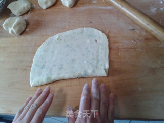 然后压扁,面板撒一层薄干面粉,将葱油面团擀成薄面皮,从一边卷起
