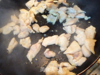 热锅放入凉油后,放入姜末爆香,将鸡胸肉炒散。