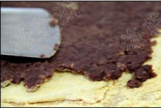糯米面团最后制成0.5cm后的面皮,上面涂抹红豆沙,刮平。