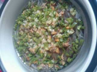 将蛤蜊摆放在沥干的粉丝上,再把蒜茸和青椒均匀撒上!同时,把腌制蛤蜊的酱料加点清水,稀释酱油的颜色,再加点盐,调整下味道淋在上面!放进电饭煲蒸20~30分钟!
