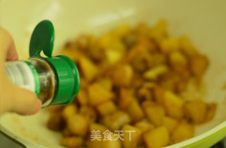 煎至土豆微焦至半透明状调入生抽、料酒、蚝油、番茄酱