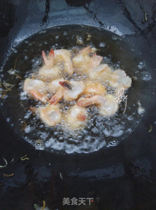 锅里的油再次烧至5成热时下虾球炸至金黄,出锅前把火再开大点逼出虾里多余的油