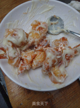 把虾球加适量的沙拉酱,拌匀,让每个虾都完整的沾到沙拉酱