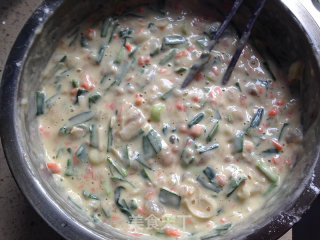 加入适量的面粉和水,以及盐糖调味,两勺搅拌一次使得面粉能搅拌均匀。(调味品可以先放至水里化开,这样味道准确掌握~)