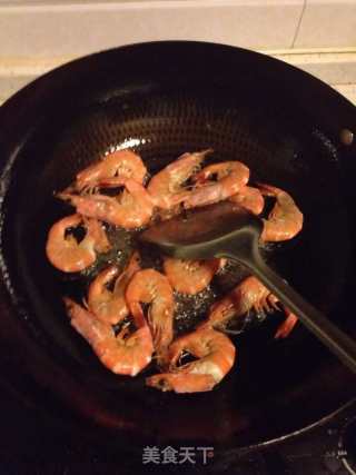 热锅放油,放入虾,大火把虾皮爆脆后捞出。锅中留油。