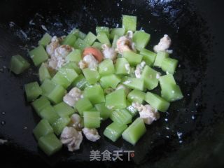 锅中先倒入腌制过的扇贝煸炒,再倒入莴笋,加盐,鸡精料酒调味。