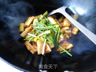 汤汁收至浓稠后,将剩余的葱段放入,撒点胡椒粉翻炒均匀即可出锅