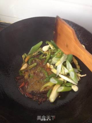 锅里热油下花椒干辣子及一勺郫县豆瓣翻炒。