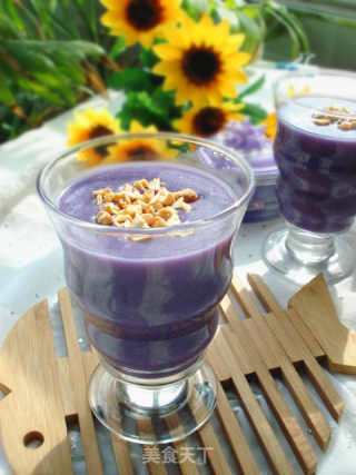 “ 紫薯中含有丰富的蛋白质,18种易被人体消化和吸收的氨基酸,维生素C、B、A等8种维生素和磷、铁等10多种天然矿物质元素。其中铁和硒含量丰富。而硒和铁是人体抗疲劳、抗衰老、补血的必要元素,特别是硒被称为“抗癌大王”。剩米饭加紫薯打成糊,加上同样营养丰富的腰果碎,口感丰富,营养加倍! ”
