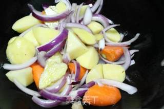 待红萝卜和土豆炒至稍微有些变色时,加入牛肉一起翻炒