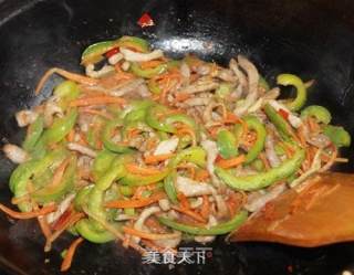 锅内放油烧热,放肉丝迅速拨散,炒纸肉变色了捞出。