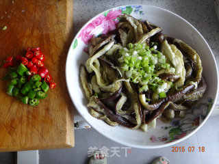 青红椒切碎,蒸好的茄子撕条,葱末蒜末放上。