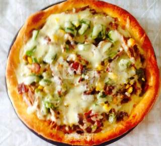 pizza面饼:高筋面粉低筋面水玉米油细砂糖干酵母,盐,奶粉揉成面团,使劲揉,揉到面团变得十分劲道,抻开面团,面团能形成一张比较薄的薄膜(扩展阶段),就可以了。把面团放在26度左右的环境下,盖上保鲜膜,发酵到变成2倍大(夏天放在室温就可以)。