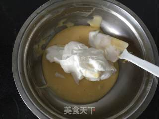 取三分之一的蛋白到蛋黄糊中,翻拌均匀(注意不要画圈搅拌,以免消泡)