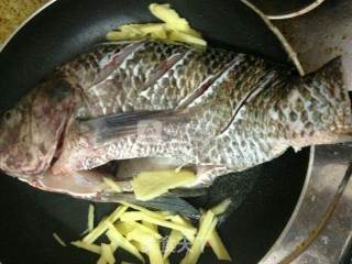 鱼两面翻一下,放入生姜丝,两面煎至金黄色,倒入少许料酒。