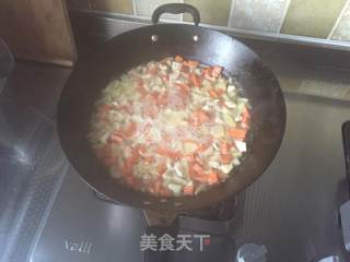 炒到八分熟加入咖喱在炒2分钟左右 食材和咖喱炒匀了