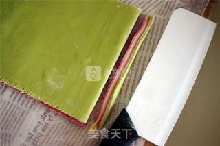 将切出来的彩色条从厚到薄压面,注意最后用2档压面。