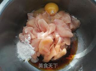鸡胸肉用适量盐、酱油、料酒、十三香、鸡蛋、淀粉搅拌均匀,腌制20分钟。