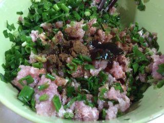 豬肉攪碎成餡,加入剁好的蔥末,加五香粉,芝麻油,鹽,雞粉,蠔油,生抽,花生油(多點)順時針攪拌。